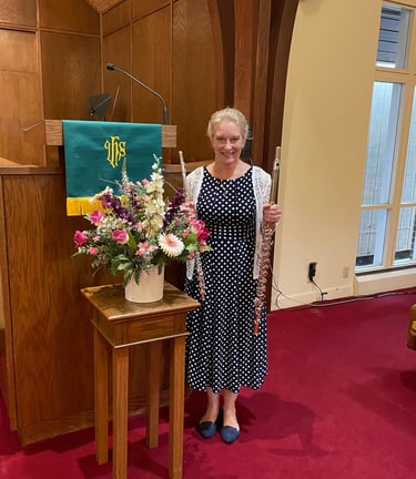I am available as a flute soloist for church and civic settings. For church and weddings, I have a repertoire of fresh arrangements of standard Christian hymns which can be played with your pianist or against my recorded backing tracks. I have several selections for alto flute, which always delights audiences. For civic spaces, I come as the High Flute'n Lady with an broad repertoire of pop, classic, Celtic and original flute music played against recorded backing tracks.
